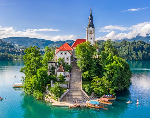 El lago más emblemático de Eslovenia, enmarcado por los Alpes Julianos. Toma una embarcación tradicional pletna hasta la isla y disfruta de unas vistas alpinas perfectas.